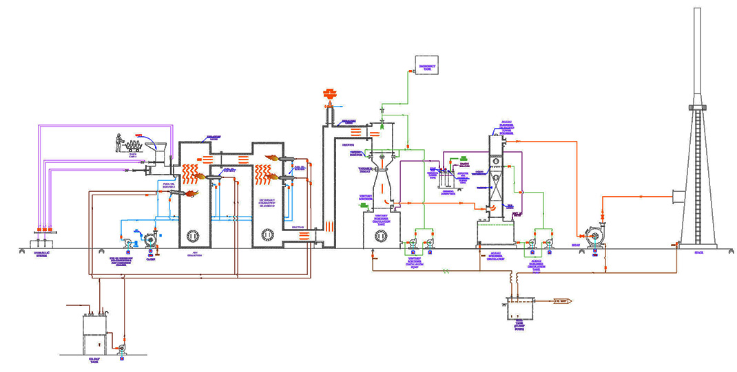The Flue gases coming from the primary furnace containing volatiles & unburnt carbonaceous material is burnt in secondary furnace in turbulent conditions. Complete oxidation of the flue gases is ensured by maintaining temperature above 1000 Deg C & supply of additional Air. A proper residence time is ensured for complete destruction of all volatiles.